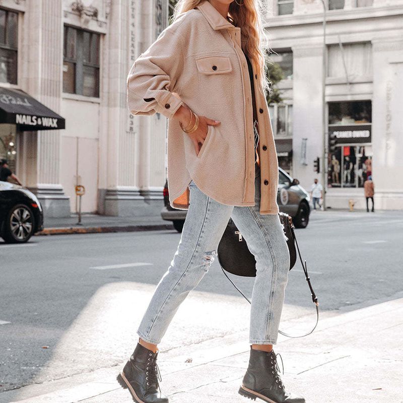 Design: Collared, Button Up, Long Sleeves, Patched, Stitch, Wool Jacket, Wool Blend, Woolen, Large Pockets, Casual and Oversized.